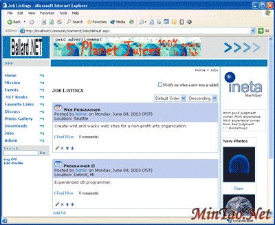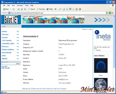 图 12 显示了 Ballard .NET 社区站点的 JobSection 页。如果您单击工作公告下面的“Read More”链接,将显示如图 13 所示的 Job 页。
