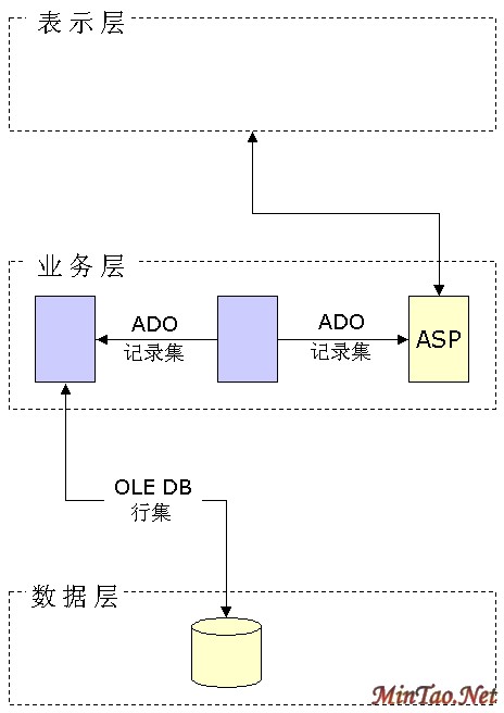 图 1. 目前的分布式 Web 系统的典型体系结构 表示层通常基于 HTML 3.2 输出,并能够很好地与任何较新的浏览器一起工作。网页是在 Web 服务器上使用 Active Server Pages (ASP) 构建的,并且只有在一些相当特殊的情况下才试图通过 COM、动态 HTML 和 XML 支持来提供浏览器的实际功能。 关键之处是中间层,其中通常有一层或多层业务对象获取并交换数据来响应用户的输入。这些组件可能需要彼此传递数据,并且在传递数据的过程中,它们需要一种易于使用、功能强大并为所有组件所理解的公用数据格式。ADO 记录集 — 表或视图的 ADO 表示 — 是一个相当不错的解决方案,它有几个优点,并且只有一个大的缺点。 ADO 记录集的灵活性足以使您能够毫不费力地定位记录以及使用过滤器和书签。它们还提供排序、自动分页和持久性等功能,并能在与数据源断开时工作。可以在多层之间相当高效地汇集记录集,这归功于其固有的并且极为紧凑的二进制格式 — Advanced Data Table Gram (ADTG) 格式。 断开的记录集在组件之间的传输涉及到 COM 汇集,并强制接收组件配合这一汇集。换句话说,只有 COM 对象才能使用 ADO 记录集。这在 COM/DCOM 在业务层中占主导地位的同构体系结构中不成问题。显然,当有关的服务器端组件的映射涉及到诸如大型机或 Unix 平台之类的异构节点时,就会带来很大的不便。 所谓的 Internet 的第三个阶段使这一方案离我们更近了。它预示了一个世界,在这个世界中,功能实现通过各种 Web 服务(即可以通过 HTTP 访问的环绕着我们的卫星系统)成为可能。您将需要向这些服务中的某个传递一些记录以进行进一步处理,这个方案并不是什么勉强的事情。没有什么比 Web 服务更加容易的事了 — 不管它的内部体系结构或公共编程接口如何 — 它不接受 ADO 记录集。 A目前现实中的 ADO,特别是记录集,是在 Windows 和基于 COM 的方案中操纵数据的强有力的工具。不幸的是,随着您的系统逐渐向完全的 Internet 互操作性方向演变,它们逐渐丧失了其吸引力。
