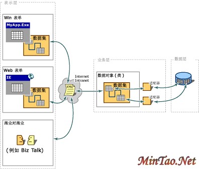图 2. 在 DNA 方案中使用 ADO+ 表示层可以通过 Win Forms 或 Web Forms(这两种编程单元专用于 Microsoft Visual Studio.NET 平台)使用或创建数据集。在任一种情况下,运行于业务层的组件都接收一个 XML 流并进行任意处理。这些组件可以重新构建一个 ADO+ 环境,也可以将数据按原始 XML 处理并使其适合于发送到物理数据存储器中。业务组件可以获取 ADO+ 数据,将其转换为 XML,然后将其发送回客户机。任何可以理解 XML 的应用程序都可以在任一点上介入这一架构。 可伸缩性是分布式系统在不丧失效率的情况下对数目逐渐增长的客户机进行服务的能力。可伸缩性是一个常与数据库有关的术语,这是由于分布式系统很大程度上依赖于数据库。可伸缩性无论对于数据库服务器还是对于封装了数据访问操作的任何软件制品都是一个可以持续存在的问题。可伸缩性的最大敌人就是对关键资源的滥用。在分布式系统中,关键通常意味着有限。数据库连接就是可以影响可伸缩性的关键资源的一个示例。固定数目的连接的可用性对系统的增长及其能力形成了一个实际的限制。好的软件了解这种情况并采取适当措施限制其影响。ADO+ 对这一问题的处理是怎样优于 ADO 的呢?并不是说 ADO 是不可伸缩的,而是说对断开的和内存中的表的内在使用(这是 ADO+ 的特征)使 ADO+ 成为内在具有更大可伸缩性的解决方案。它具有更大可伸缩性的原因在于断开的数据集不在很长的时间内保留锁或保持打开连接。如果使用 ADO,您必须编写代码才能获得这一功能;而使用 ADO+ 则会免费获得这一功能。 将 XML 用作数据集的传输语言可以比 ADO 更有效地进行数据共享。首先,绕过诸如记录集之类的 COM 对象所必需的 COM 汇集使组件可以使用它们要使用的任意数据类型的集合。这还会带来更好的性能,因为不再需要确保记录符合标准的 COM 数据类型的数据类型转换。XML 和 HTTP 的使用还允许数据跳过防火墙。正常情况下,防火墙允许 HTTP 数据包通过,但会阻止任何试图经由端口号不是 80 的端口进来的任何其它内容通过。