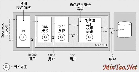 ASP.NET 提供了各种可配置的编程关口。其中包括 URL 授权、文件授权、主体权限需求和 .NET 角色。