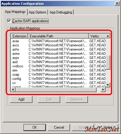 您可以自定义 IIS,以指定扩展名与 ISAPI 扩展的映射关系。图 1 显示了 Internet Information Services 管理工具的“应用程序配置”对话框。请注意,与 ASP.NET 有关的扩展名(.aspx、ascx、config、asmx、rem、cs、vb 及其他)均已映射到 aspnet_isapi.dll ISAPI 扩展。