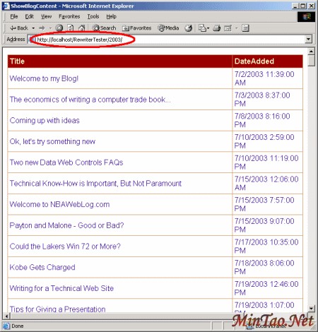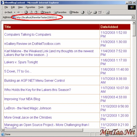 图 5、6 和 7 显示了操作中的 URL 重写。数据实际上是从我的 blog http://scottonwriting.net/ 中拖过来的。图 5 中显示了 2003 年 11 月 7 日的帖子;图 6 中显示了 2003 年 11 月的所有帖子;图 7 显示了 2003 年的所有帖子。