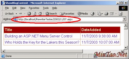 当请求 /2004/03/19.aspx 时,IIS 将通知 .aspx 扩展,并将请求路由到 ASP.NET 引擎。请求在 ASP.NET 引擎的管道中移动时,URL 将被重写为 ShowBlogContent.aspx?year=2004&month=03&day=19,并且访问者会看到 2004 年 3 月 19 日的 blog 条目。但是当用户浏览到 /2004/03/ 时将会发生什么情况呢?除非有一个 /2004/03/ 目录,否则 IIS 将返回一个 404 错误。此外,此目录中还需要具有 Default.aspx 页面,以便可以将请求传递给 ASP.NET 引擎。