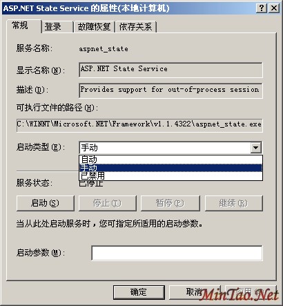 实际目录取决于您实际运行的 Microsoft® .NET Framework 版本。使用状态服务器之前,应确保该服务就绪并正运行在用作会话存储设备的本地或远程计算机上。状态服务是 ASP.NET 的组成部分并与之一起安装,因此您无需运行其他安装程序。默认情况下,状态服务并没有运行,需要手动启动。ASP.NET 应用程序将在加载状态服务器之后立即尝试与之建立连接。因此,该服务必须准备就绪且正在运行,否则将引发 HTTP 异常。下图显示了该服务的属性对话框。
