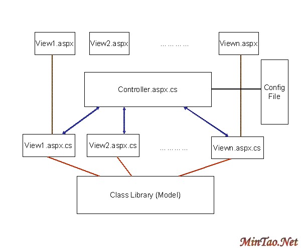 控制器 在ASP.NET中,你通常直接地请求服务。取代身为子控制器的一个服务,它是我们进入ASP.NET应用程序的主要切入点。这里不提供的一个中心的位置判断你是否有权限使用该服务, 或者也不提供任何其他的通常应该在所有的服务中发生的处理。然而, 使你所有的与aspx关联的各个类继承一个通用的System.Web.UI.Page子类, 你就可以放置这些全部的预先处理代码到覆盖了Page类的OnLoad()方法中。OnLoad()会在每次页面被装载的时候被.Net框架调用。在你的与aspx代码关联的类中调用Page_Load()方法之前, 这里可以让你作为一个中心位置验证服务是否被允许使用以及做一些重定向, 这里你可以使用Server.Transfer()就好象真的中央控制器一样。我命名了我的视图控制类Controller。一旦你必须在显示任何的aspx页面之前验证登录信息或为用户做一些初始的操作, 那么这些都可以组合到OnLoad()方法中。