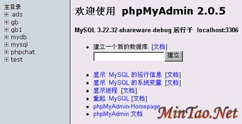 步骤六:进入phpmyadmin管理MySQL的Web界面。打开浏览器,在浏览器的地址栏里输入“http://localhost/mysql/index.php3”,接着就会出现如下图所示的phpmyadmin管理页面。现在,你可以对MySQL数据库进行操作了。