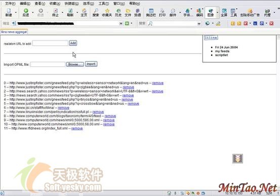 经过以上的配置,就可以开始使用Lilina来做RSS新闻聚合了,首先我们打开http://www.myweb.com/lilina/edit.php ,这时我们可以看到如下的页面图1: