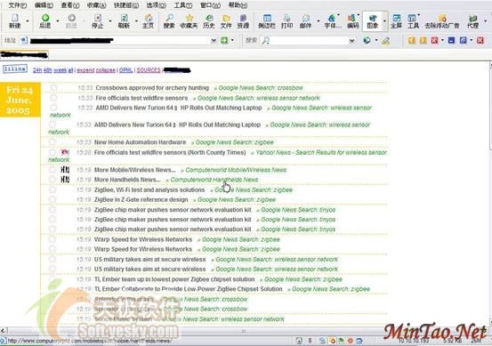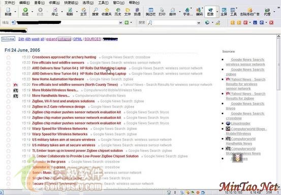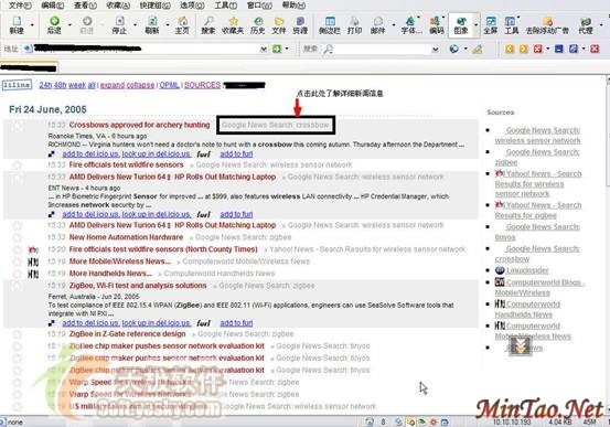 最上面一行的链接,24h、48h、week和all分别可以代表选择不同时间段的新闻内容,expand表示同时显示标题和新闻简介,collapse表示收起所有的新闻简介,只显示标题。图3的页面上显示了2005年6月24日笔者的新闻聚合内容,红色字体显示的是标题,灰色字体表示新闻的来源,页面的右边为RSS源的总体介绍和图标。点击页面上的红色字体可以打开新闻简介,如图4所示。如果你对这条新闻感兴趣,只要点击红色字体后面紧跟着的灰色新闻来源,即可链接到这条新闻的真正页面上,详细了解新闻信息。