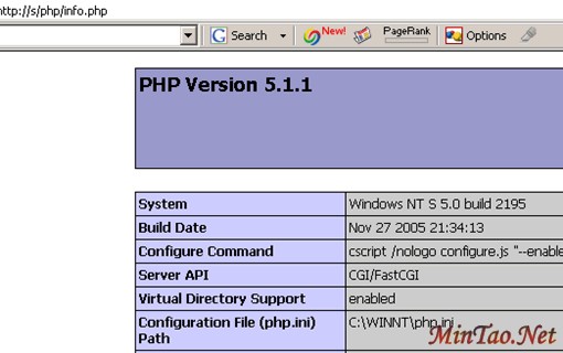 在iis里数据http://localhost/php/info.php如果出现一长串的PHP Version 5.1.1等样子的话,恭喜,配置好了。如图: