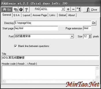 启动软件进入运行主界面,首先在菜单栏中FAQ后面点击“+”按钮新建一个FAQ网页,然后在“General”标签上选择网页保存路径,输入文件保存名称、格式,并选择字体和文字大小,在“Title”里输入网页标题,还可以在“Header code”里输入网页头部HTML代码,丰富FAQ网页效果。接下来就可以添加问答项目了。