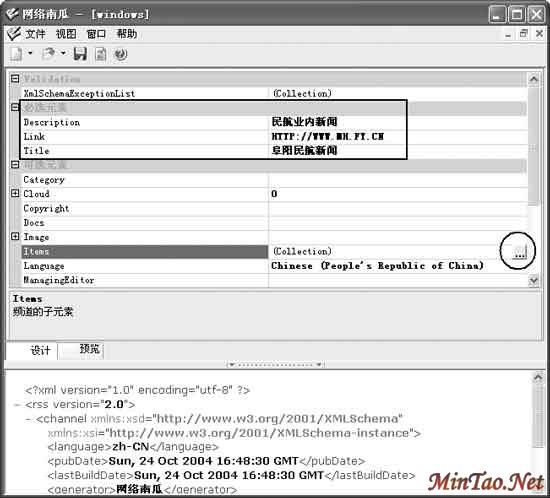 还可以使用一些如< language >(语言)、< copyright >(版权声明)等可选语句来丰富< channel >内容,具体的新闻提要就要依靠- 来体现了。一般一条新闻就是一个< item >,< item >下至少要存在一个< title >或< description >,其他语句可以根据需要进行选择。