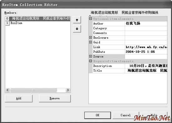 如果网站更新的新闻量大,依靠手工编写RSS文件就有可能出错。我们可以请RSS生成器(下载地址:http://sq.onlinedown.net/down/rsscreator.rar)来辅助我们工作。开启软件,执行“文件→新建→RSS”新建一个RSS文件(图1)。首先在上方“必选元素”区输入“Description”、“Link”和“Title”三个必选语句的内容,要添加新闻条目就点击“Items”后的按钮进入新闻添加窗口(图2),单击“Add”按钮增加一个新闻条目,然后在左边的语句中根据提示添加新闻标题(Title)、简要(Description)和链接(Link)等,完毕后返回到软件主界面,按下工具栏中的保存按钮将文档保存为 .xml文件即可。