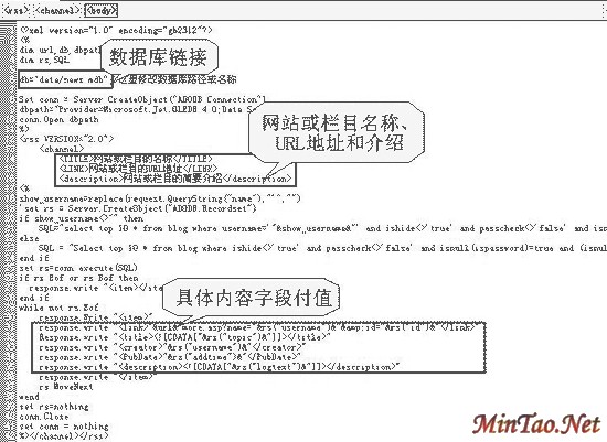 对于静态网站我们可以手工或使用工具来编写RSS输出,若是动态网站则要通过程序来转换新闻数据库内容输出RSS了。有兴趣的朋友可以在http://www.mh.fy.cn/rss2.rar处下载转换模板,此模板适合ASP+ACCESS类的动态网站更新系统,需要修改的是数据库链接部分db=*.mdb。另外在数据库字段读取以及给新闻标题(Title)和链接(Link)等字段赋值也要根据数据库的具体情况做一些修改(图3),使用该模板调试成功后,网站的RSS输出地址就是http://你的域名/rss2.asp。