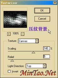 把当前图片进行像素移位整理:Filter--Pixlate--Fragment;制作出压纹最终效果:filter--texture--texturize,参考值: Texture:Cavas,Scaling:140%,Relief:5,Light Deretion:top