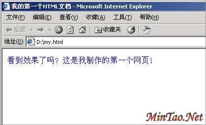 <html> <head> <title>我的第一个HTML文档</title> </head> <body> <font color="blue">看到效果了吗?这是我制作的第一个网页!</font> </body> </html>