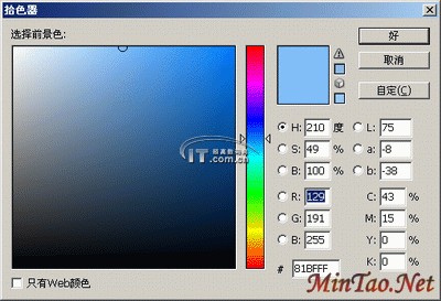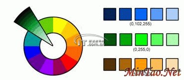 在Photoshop的色彩选择窗口中,我们可以这样进行建立单色方案。首先调整H(也就是Hue的缩写)后面的值来调整色调。注意,H的单位是度,也就是基本颜色在颜色环上所处位置的角度。