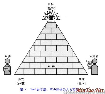 如图1 - 1所示,把Web站点比喻为一个金字塔是很形象的。内容是建筑金字塔的砖块,而基础是建立在外观与技术之上的,它很大程度上依赖于网站建设的经济效益。作为Web设计者,应尽力认真地设计,但整个过程会是很困难的。Web技术的不断更新使得设计网站极具挑战性,它需要联合作业以及对Web媒体的透彻理解。即使我们是Web设计专家,能建立美观而实用的站点,用户也可能在面对我们的作品时显得很困惑。Web设计者经常花大量的时间去考虑他们自己的需求而不是了解用户的需求。我们的Web金字塔概念看起来有可能非常像真实的砖块结构的金字塔一样—一个密不可透的坟墓—以至于用户非常困惑而找不到门。用户是否理解站点的要点呢?尽管Web开发所遇到的困难与古埃及人建造金字塔所遇到的挑战不一样,但建造一个实用、令人愉悦并能接受因特网时代的考验的站点并不是一件非常容易的事情。