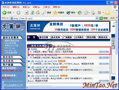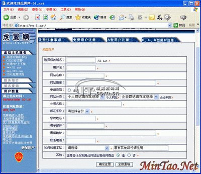 因为我们是初次制作自己的个人网站,所以首选的空间大多是免费的空间。在这里我就带领大家一起来申请一个免费的服务空间。打开www.51.net,在这里我们选择免费型的空间,大小为20M,对于个人站点来说足够了,点击免费型后面的登记注册(如图1),这个时候会弹出服务条款,在这里我们只有选择同意才能进入下一步,点同意之后进入,会要求我们再次选择注册的类型,这里我们当然选择免费用户注册了,这个时候会弹出免费与收费用户的服务区别。