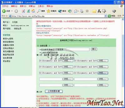 例如我们打开www.myrice.com的免费主页http://diy.lycos.com.cn/,在输入申请空间时的用户名和密码就可以进入如图3所示的上传界面。首先点击浏览按钮选择要上传的文件,一次可以最多上传十个文件,选择好文件之后就可以点击上传按钮就可以了。如果有多个文件只需要重复上面的操作就可以了。怎么样这个是不是很简单呢?