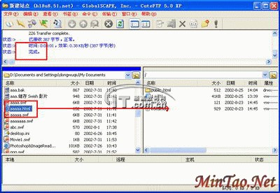 现在我们就对添加的站点信息进行一些设置,首先输入站点标签,这个主要是为了以后记忆的方便,读者可以根据自己的内容自行设定,然后输入FTP地址,也就上你上传网页的地址,这个地址一般在邮件服务商发给你的信中就可以看到,然后输入你申请时的用户名以及密码,其它的保持默认值不变,点"连接"按钮,这样就会自动连接到服务器上,等显示完成之后我们就可以上传文件了(图5)。在左侧我们先选中要上传的文件,然后直接拖动选中的文件到右侧的远程服务器文件列表中,会提示你是否上传选中的文件,点是就可以上传文件了,通过这种方法我们可以一次上传多个文件而且上传的速度也很快,读者可以根据自己的需要选择不同的上传文件的方法。