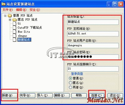 安装好软件之后就可以上传了,点击文件按钮,打开其中的站点管理器,弹出如图4所示的站点设置对话框,点下部的"新建"按钮就会自动添加一个站点信息。