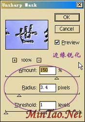最后对文字进行边缘锐化:Filter--Sharen--Unsharp Mask,参考值:Amount:150%,Radius:3.4,Threshold:1;如下图的操作: