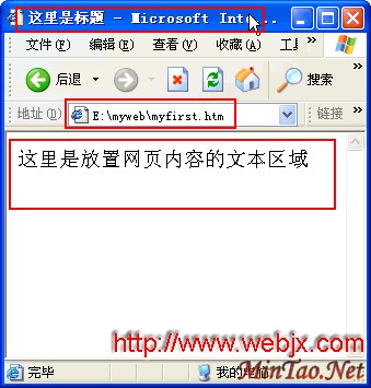 2.在您的浏览器的地址栏内输入 e:\myweb\myfirst.htm 或是 file:///e|/myweb\myfirst.htm 吧!(因为每个浏览器打开硬盘中文件的方式都不太一样,所以用这样的方法比较一致。)