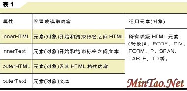 HTML块级元素(对象)提供的4个可读写属性innerHTML、innerText、 outerHTML、outerText来更改元素(对象)内容(如表1所示)。