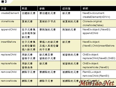 IE 5.0中文档对象模型(DOM)提供的修改元素(节点)的方法如表2所示。