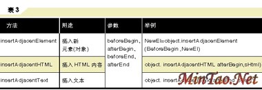 插入网页新元素(对象)、HTML或文本内容 此外,也可用insertAdjacenElement、insertAdjacentHTML和insertAdjacentText等方法分别在元素(对象)的指定位置插入新元素(对象)、Html或文本内容(如表3所示)。