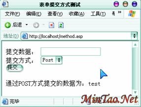 通过IIS运行本例代码(用http://localhost/method.asp这种方式来浏览,有关IIS的安装和配置,请参考第四部分),输入所提交的数据,选择Post方式提交,将看到图1.4.4所示的效果。选择Get方式提交,效果将如图1.4.3所示。
