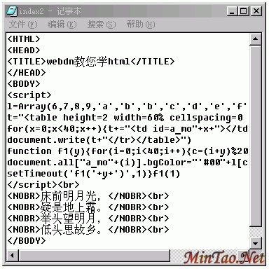 我们知道,在网页中可以用<hr>标识来做分割线,也可以把表格设置为1个象素高或宽充当分割线。现在,我们将表格与Javascript结合,可以做出更生动的分割线——流动的分割线。加入以下代码,你就可以看到一条分割线,颜色在不断的流动。