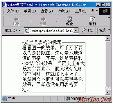 几行代码就可以搞掂了!修改width值可以设置表格宽度。<legend>和</legend>之间是表格的标题,你可以设置表格标题的颜色、大小等,甚至是加上个链接。</legend>标识之后,就可以任意添加表格中的内容了,同样也可以添加任意的内容,如文字、表格、图片等。
