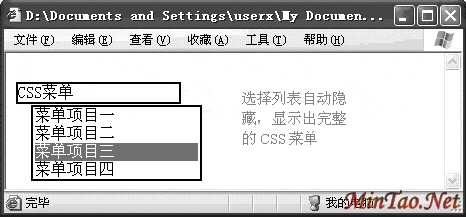 <div id="main" style="position:absolute;width:200px;"> <div id="menuBlock" class="menuBlock" onmouseover="showMenu();" onmouseout="hideMenu();">CSS菜单</div> <div id="subMenus" > <div id="0" onmouseover="setStyle(this)" onmouseout="setDefault(this)" >菜单项目一</div> <!--共四个菜单项目 --> </div><P> <select id="lb_1" name="lb_1"> <option value="-1"/>选择列表 <!-- 三个选项 --> </select> </div> </body></html>