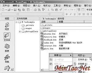 首先我们执行菜单“视图/文件夹”命令打开文件夹列表窗口,然后在站点根目录下建立一个新网页。单击鼠标右键,执行“新建/网页”命令,并将此网页命名为new.htm(如图1)。