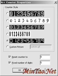 计数器可以统计并显示网页的访问次数。向网页中添加计数器的方法是,在网页视图中打开站点首页index.htm,将插入点放在要放置计数器的位置,然后执行“插入/Web组件”命令,在左边的窗格中选择“计数器”,并在右边窗格中选择计数器样式,最后单击“完成”按钮进入计数器参数设置对话框(如图4),选择一个计数器的图片样式,如果要将计数器设置成某个特定数字,可以选中“Reset count to”选项并输入一个数字即可。若要在计数器中显示固定位数的数字,可以选中“Fix Number of digits”选项,并设定相应的数值。最后单击“确定”按钮后,网页上就会显示计数器的占位符了。