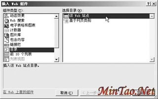 首先打开刚才创建的网页new.htm,切换到网页视图,将插入点放在要创建目录的位置,然后执行“插入/Web组件”命令,在打开的对话框中,选择“目录”(如图3),并在右边的窗格中,选择“该Web站点”后单击“完成”按钮。