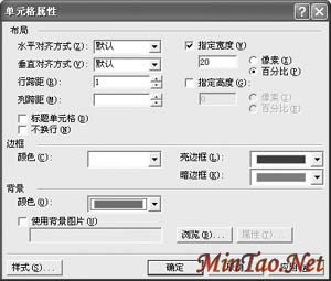 选中此5列单元格,单击鼠标右键,执行“单元格属性”命令,在打开的对话框中,设置单元格“背景”颜色为浅灰色,如图3所示。最后在刚才设置的5个单元格中,分别输入网页的导航栏目名称,并为各个栏目设置好相应的链接。