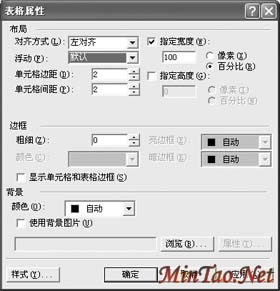 在“网页”视图中,用鼠标右键单击表格,并从快捷菜单上选择“表格属性”命令,打开表格属性对话框,如图2所示。