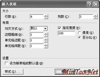 新建一个空白网页,然后将插入点放在要插入表格的位置,执行菜单“表格/插入/表格”命令,打开插入表格对话框。在“行数”、“列数”框中分别输入4和3,在“对齐方式”框中选择表格在网页上的位置为默认,并在“边框粗细”框中输入表格边框宽度为0,即不需要表格边框。要改变单元格边框和内容之间的间距,可以在“单元格边距”框中输入数值,改变单元格之间的间距可以在“单元格间距”框中输入数值,如图1所示。