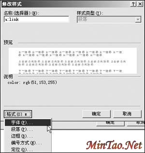 在“网页”视图中,执行“格式/样式”命令,打开样式对话框,然后单击“新建”按钮,在“名称”框中输入新样式的名称为“.pal”,然后在“样式类型”下样式选择为“段落”。然后单击“格式”,再按照前面介绍的方法设置新样式的格式特征,比如字体、段落等。