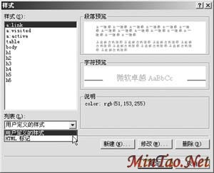 首先在左侧的“样式”框中,单击要修改的样式类型,比如“a:link”,然后在下方的“列表”中选择“用户定义的样式”选项,需要注意的是,如果此时要修改标准HTML标记,可以选择“HTML 标记”。接着在样式列表中双击“a:link”样式,打开“修改样式”对话框,如图3。如果要设置对齐方式、缩进或段落间距,可以选择“段落”,设置边框和底纹可以选择“边框”,设置项目符号和编号的样式,可以选择“编号”。完成设置后,关闭所有对话框返回到CSS文件。这样我们就完成了一个样式的设置,可以将设置好的样式直接应用到网页文件指定的文字、段落中。