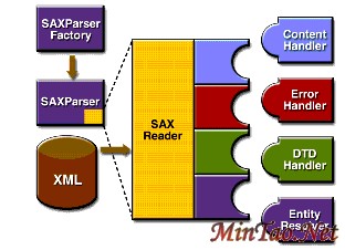 系统是从SAXParserFactory产生parser的实例开始的。一个parser中包含了一个SAXReader对象,当这个parser调用parse方法的时候,这个reader就调用回调方法已实现这个应用;而这些方法呢?是定义在ContentHandler,ErrorHandler,DTDHandler and EntityResolver接口中的。