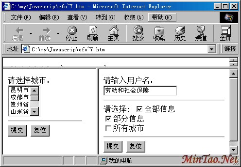 第二个框架 主要作用是实现交互。可以通过JavaScript脚本将所示的“云南省”和“四川省”分别改为“昆明市”和“成都市”。 Test9_2.htm <HTML> <HEAD> </HEAD> <Body> <Form name="test9_1"> 请选择城市:<BR> <Select name="select1" Multiple> <Option>云南省 <Option>四川省 <Option>贵州省 <Option>山东省 <Option>江苏省 <Option>浙江省 <Option>安徽省 <Option>河南省 </select><BR> <HR> <Input Type="Submit" name="" value="提交"> <Input Type="reset" name="" value="复位"> </Form> <pre> <script language="JavaScript"> document.test9_1.elements[0].options[0].text="昆明市"; document.test9_1.elements[0].options[1].text="成都市"; </script> </pre> </Body> </HTML> 第三个框架 主要作用是实现交互。 Test9_3.htm <HTML> <HEAD> </HEAD> <Body> <Form name="test9_2"> 请输入用户名: <Input Type="text" name="text1" Value="" Size=20><BR> <HR> 请选择: <Input Type="Checkbox" name="checkbox1" Value="qb">全部信息<BR> <Input Type="Checkbox" name="checkbox2" Value="bf">部分信息<BR> <Input Type="Checkbox" name="checkbox3" Value="sy">所有城市<br> <HR> <Input Type="Submit" name="" value="提交"> <Input Type="reset" name="" value="复位"> <BR> </Form> <script language="JavaScript"> document.test9_2.elements[0].value="劳动和社会保障"; document.test9_2.elements[1].checked=true; document.test9_2.elements[2].checked=true; document.test9_2.elements[3].checked=false; </script> </Body> </HTML>