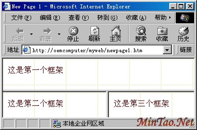 图 9-2 在浏览器中结果 本讲介绍框架中的基本元素的主要功能和使用,利用JavaScript脚本可以非常方便、灵活地实现Web页面更为复杂的信息交互,这是HTML标识语言所不能具备的。从中可以看出JavaScript是多么的吸引众多的Web设计人员。