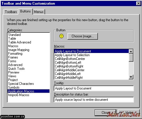 有几中方法可以运行JavaScript宏。第一种方法是将工具条的按钮与宏联系起来并且将这个按钮增加到HoTMetal的用户界面中去,这种方法在前面已经讲过了。在本节教程中将对第一种方法进行一点点变形,从对话框中将新的按钮拖拉到工具条区域,如图6所示是拖拉后的HotMetal的窗口: