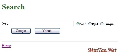 1 <%@ Page Language="C#" AutoEventWireup="true" CodeFile="Search.aspx.cs" Inherits="Search" %> 2 3 <!DOCTYPE html PUBLIC "-//W3C//DTD XHTML 1.0 Transitional//EN" "http://www.w3.org/TR/xhtml1/DTD/xhtml1-transitional.dtd"> 4 5 <html xmlns="http://www.w3.org/1999/xhtml" > 6 <head runat="server"> 7 <title>Search</title> 8 <script language="javascript" type="text/javascript"> 9 // <!CDATA[ 10 11 function GetEncodeOfKey() 12 { 13 var strKey = window.document.getElementById("Text_Key").value; 14 return encodeURIComponent(strKey); 15 } 16 17 function GetUrl(site) 18 { 19 var encode=GetEncodeOfKey(); 20 21 //web 22 if(document.getElementById("RadioButtonList_Kind_0").checked) 23 { 24 if(site=="google") 25 { 26 return "http://www.google.com/search?q="+encode+"&ei=UTF-8"; 27 } 28 else 29 { 30 return "http://search.yahoo.com/search?p="+encode+"&ei=UTF-8"; 31 } 32 } 33 //mp3 34 else if(document.getElementById("RadioButtonList_Kind_1").checked) 35 { 36 if(site=="google") 37 { 38 return "http://www.google.com/search?q="+encode+" mp3"+"&ei=UTF-8"; 39 } 40 else 41 { 42 return "http://audio.search.yahoo.com/search/audio?&p="+encode+"&ei=UTF-8"; 43 44 } 45 } 46 //img 47 else if(document.getElementById("RadioButtonList_Kind_2").checked) 48 { 49 if(site=="google") 50 { 51 return "http://images.google.com/images?q="+encode+"&ei=UTF-8"; 52 } 53 else 54 { 55 return "http://images.search.yahoo.com/search/images?p="+encode+"&ei=UTF-8"; 56 } 57 } 58 else 59 { 60 //alert("err"); 61 } 62 63 64 } 65 66 function Button_Google_onclick() 67 { 68 window.open(GetUrl("google")); 69 } 70 71 function Button_Yahoo_onclick() 72 { 73 window.open(GetUrl("yahoo")); 74 } 75 76 // ]]> 77 </script> 78 </head> 79 <body> 80 <form id="form1" runat="server"> 81 <div> 82 <br /> 83 <br /> 84 <strong><span style="font-size: 24pt; color: #336633">Search<br /> 85 </span></strong> 86 </div> 87 <hr style="position: relative" /> 88 <br /> 89 <table style="left: 0px; position: relative; top: 0px"> 90 <tr> 91 <td style="width: 31px; height: 21px"> 92 <span style="font-family: Terminal">Key</span></td> 93 <td style="width: 253px; height: 21px"> 94 <input id="Text_Key" style="width: 248px; position: relative" type="text" /></td> 95 <td style="width: 175px; height: 21px"> 96 <asp:RadioButtonList ID="RadioButtonList_Kind" runat="server" RepeatDirection="Horizontal" 97 Style="position: relative" Font-Names="terminal"> 98 <asp:ListItem Selected="True">Web</asp:ListItem> 99 <asp:ListItem>Mp3</asp:ListItem>100 <asp:ListItem>Image</asp:ListItem>101 </asp:RadioButtonList></td>102 </tr>103 <tr>104 <td style="width: 31px">105 </td>106 <td colspan="2">107 <input id="Button_Google" style="width: 80px; position: relative" type="button" value="Google" onclick="return Button_Google_onclick()" />108 109 <input id="Button_Yahoo" style="left: -29px; width: 104px; position: relative" type="button"110 value="Yahoo!" onclick="return Button_Yahoo_onclick()" /></td>111 </tr>112 </table>113 <br />114 &nb