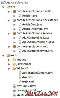 responseText 从服务器进程返回的数据的字符串形式 responseXML 从服务器进程返回的DOM兼容的文档数据对象 status 从服务器返回的数字代码,比如404(未找到)或200(就绪) statusText 伴随状态码的字符串信息 现在processVoteResponse()函数开始显示出其意义了。它首先检查XmlHttpRequest的整体状态以保证它已经完成(readyStatus == 4),然后根据服务器的设定询问请求状态。如果一切正常(status == 200),就使用innerHTML属性重写DOM的“votes”节点的内容。 既然您亲眼看到了XmlHttpRequest对象是如何工作的,就让我们利用一个旨在简化JavaScript与Java应用程序之间的异步通信的框架来对具体的细节进行抽象。 Ajax: DWR方式 按照与文章评价系统相同的流程,我们将使用Direct Web Remoting(DWR)框架实现同样的功能。 假定文章和投票结果存储在一个数据库中,使用某种对象/关系映射技术来完成抽取工作。为了部署起来尽可能地简单,我们不会使用数据库进行持久性存储。此外,为使应用程序尽可能通用,也不使用Web框架。相反,应用程序将从一个静态HTML文件开始,可以认为它由服务器动态地呈现。除了这些简化措施,应用程序还应该使用Spring Framework关联一切,以便轻松看出如何在一个“真实的”应用程序中使用DWR。 现在应该下载示例应用程序并熟悉它。该应用程序被压缩为标准的WAR文件,因此您可以把它放置到任何一个Web容器中——无需进行配置。部署完毕之后,就可以导航到http://localhost:7001/ajax_demo/dwr-ajax.html来运行程序。 可以查看HTML源代码,了解它如何工作。给人印象最深的是,代码如此简单——所有与服务器的交互都隐藏在JavaScript对象ajaxSampleSvc的后面。更加令人惊讶的是,ajaxSampleSvc服务不是由手工编写而是完全自动生成的!让我们继续,看看这是如何做到的。 引入DWR 如同在“原始的Ajax”一节所演示的那样,直接使用XmlHttpRequest创建异步请求非常麻烦。不仅JavaScript代码冗长,而且必须考虑服务器端为定位Ajax请求到适当的服务所需做的工作,并将结果封送到浏览器。 设计DWR的目的是要处理将Web页面安装到后端服务上所需的所有信息管道。它是一个Java框架,可以很轻松地将它插入到Web应用程序中,以便JavaScript代码可以调用服务器上的服务。它甚至直接与Spring Framework集成,从而允许用户直接向Web客户机公开bean。 DWR真正的巧妙之处是,在用户配置了要向客户机公开的服务之后,它使用反射来生成JavaScript对象,以便Web页面能够使用这些对象来访问该服务。然后Web页面只需接合到生成的JavaScript对象,就像它们是直接使用服务一样;DWR无缝地处理所有有关Ajax和请求定位的琐碎细节。 让我们仔细分析一下示例代码,弄清它是如何工作的。 Ajax技术简介(4)http://www.51cto.com 2005-11-17 13:49 dev2dev.bea.com.cn 应用程序细节:DWR分析 关于应用程序,首先要注意的是,它是一个标准的Java应用程序,使用分层架构(Layered Architecture)设计模式。使用DWR通过JavaScript公开一些服务并不影响您的设计。