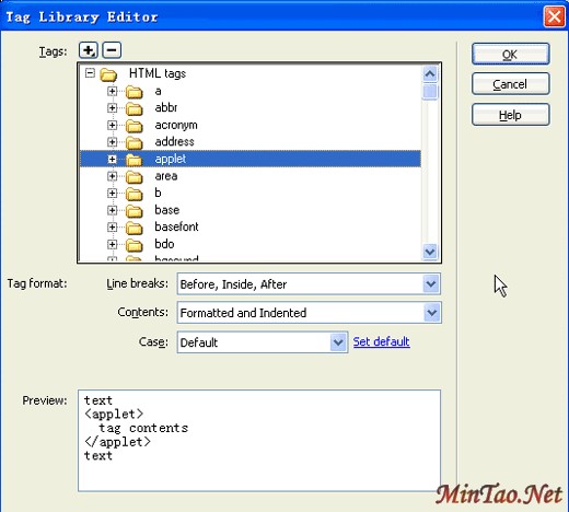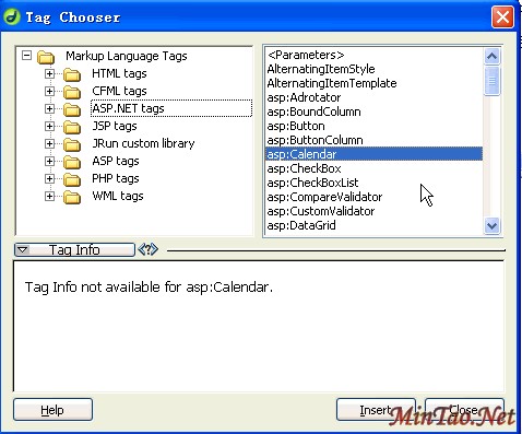 Dreamweaver MX 2004中对源代码编辑的操作功能也有一定的改进,这里列出了所有的代码标签,当我们在源代码编辑区域编写代码的时候,需要自动提示的代码标签就是从这里提取的。打开这个对话框,我们就可以一边编代码,一边取用这些标签。