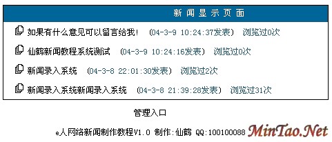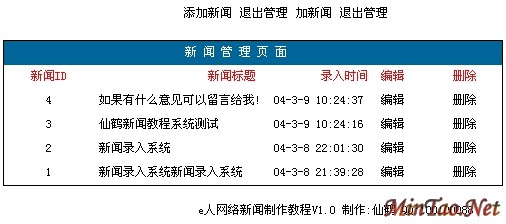 不足的地方:1.由于时间关系和对初学者的考虑我没有做分页功能,如果大家想学习,我会在下次教程写出来!2.没有写出首页调用代码,也是为初学者考虑3.对后台添加新闻表单没有验证